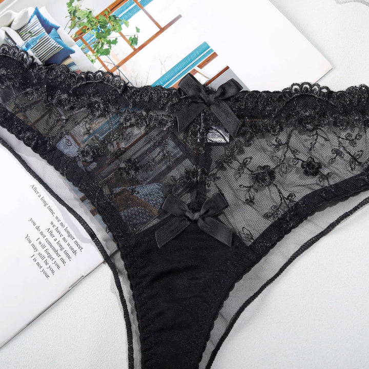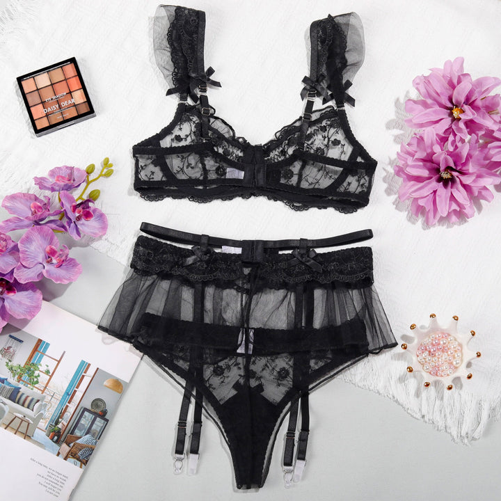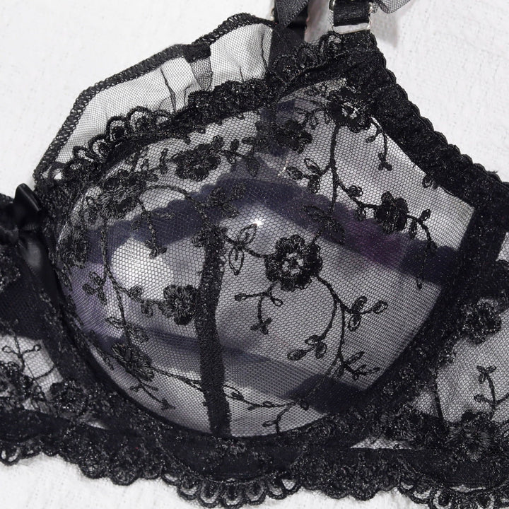This beautifully crafted lingerie set features delicate lace adorned with intricate floral patterns, offering a soft and feminine touch.