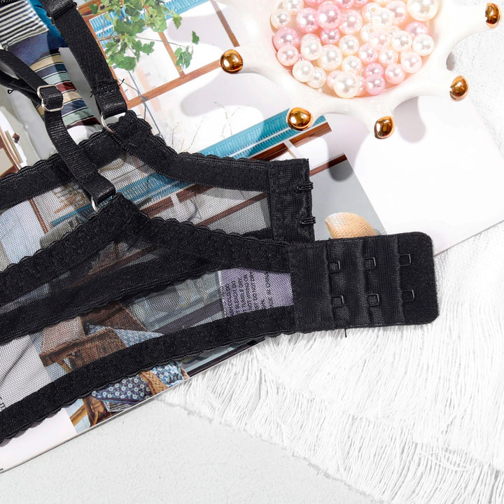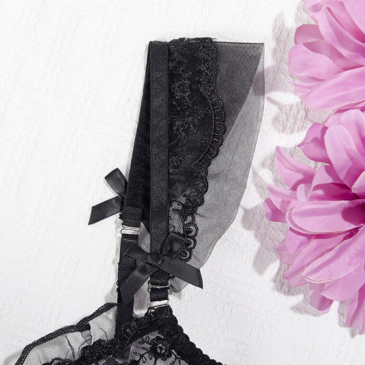 The set includes a matching suspender belt, adding a seductive, playful element to the look.
