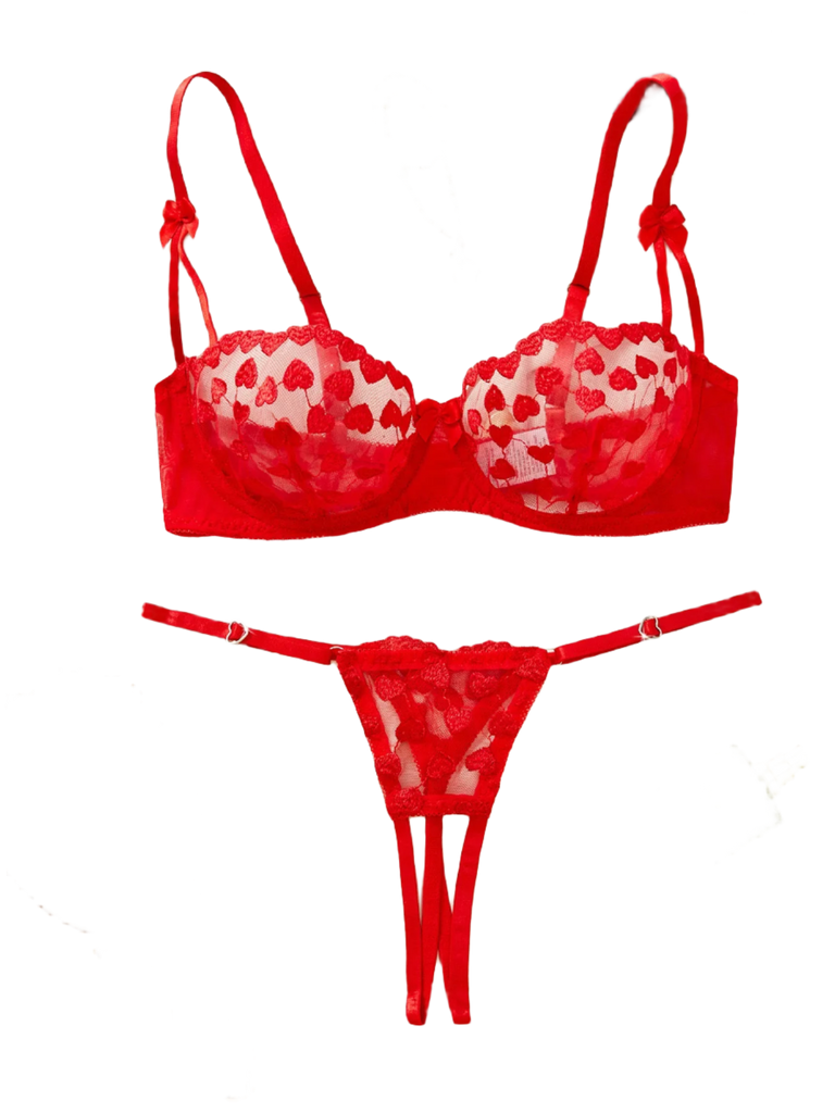 This charming lingerie set features a lace bra adorned with delicate heart-shaped embroidery, adding a touch of sweetness to its elegant design.