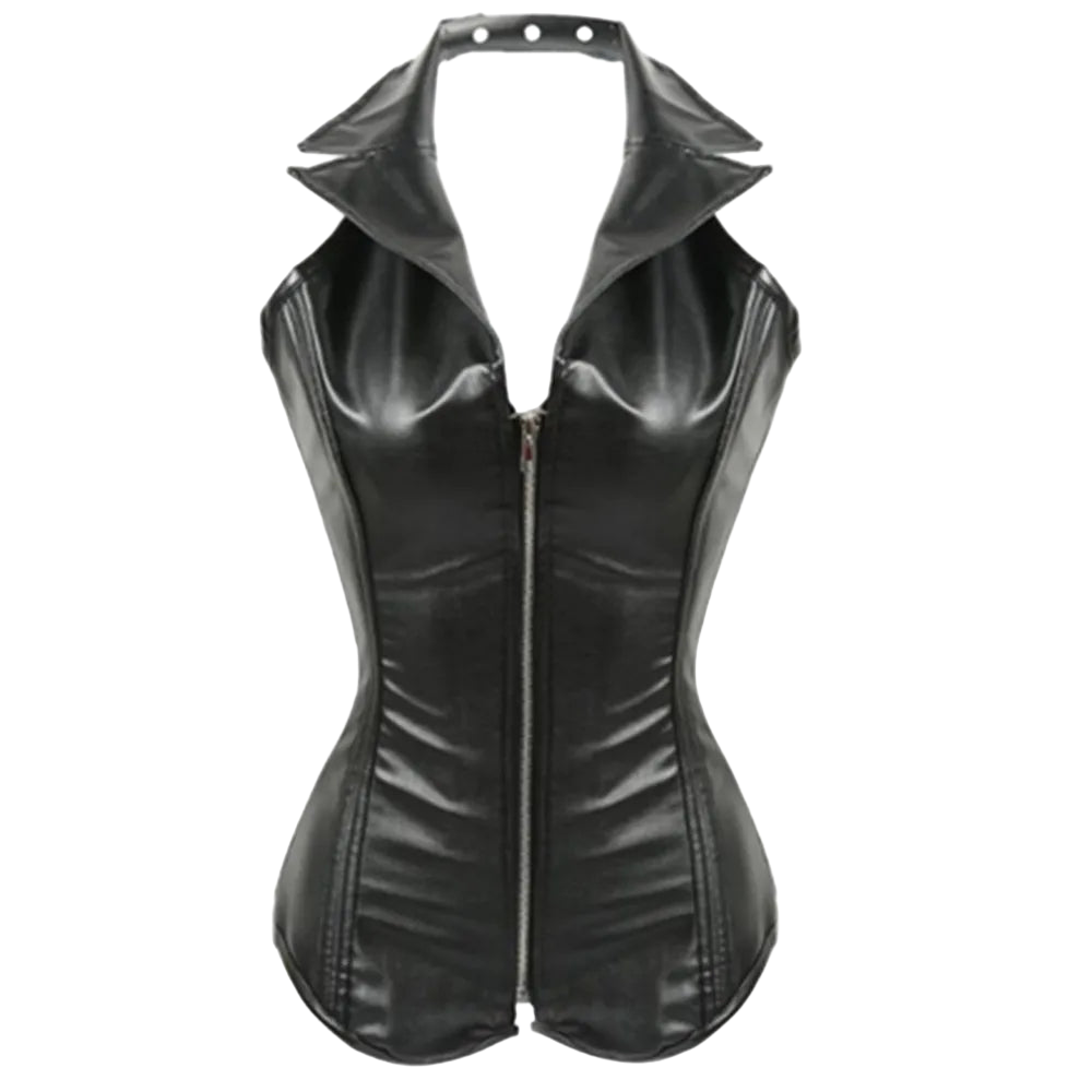 This striking corset vest features a bold leather design with lace-up sides and a front zipper closure, combining functionality with a daring look.