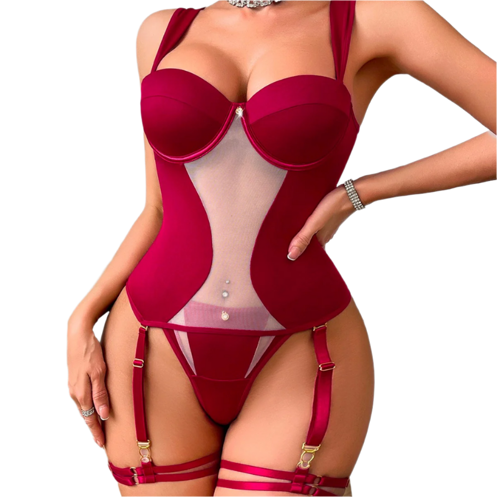 Elevate your lingerie collection with the Victoria Mesh Patchwork Elegant Corset and Panty Set with Suspenders.
